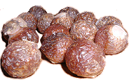 Ich wasche jetzt im Spätsommer auch meine Wäsche mit Kastanien (sonst auch mit Waschnüssen). Dazu braucht man die frischen Kastanien nur von der braunen Schale befreien, das geht gut, wenn man sie gar nicht erst trocknen läßt, sondern sofort verarbeitet – kleine Stücke schneiden und dann ungefähr 300 g in ein engmaschiges Wäschenetz in die Waschmaschine geben. (Reicht für 3 Waschgänge.) Die Stücke kann man auch einfach trocknen lassen und aufbewahren. Damit sich die getrockneten Stücke in der Maschine gut entwickeln können, mache ich ein Vorwaschprogramm dazu. Weißer Wäsche kann man noch einen Eßlöffel Soda oder Fleckensalz dazugeben. In die bunte Wäsche lege ich immer noch ein Farbfangtuch, besonders auch bei den Waschnüssen (der Sud ist leicht bräunlich). Ich habe festgestellt, dass die Wäsche viel weicher wird und vor allem schadstofffrei ist, also auch gut für die Haut. Wer es mag, kann Lavendelöl zum Waschgang dazugeben oder eine ganz minimale Menge Weichspüler. Das Waschen mit Kastanien bzw. indischen Waschnüssen ist auch besonders gut für empfindliche Babyhaut.